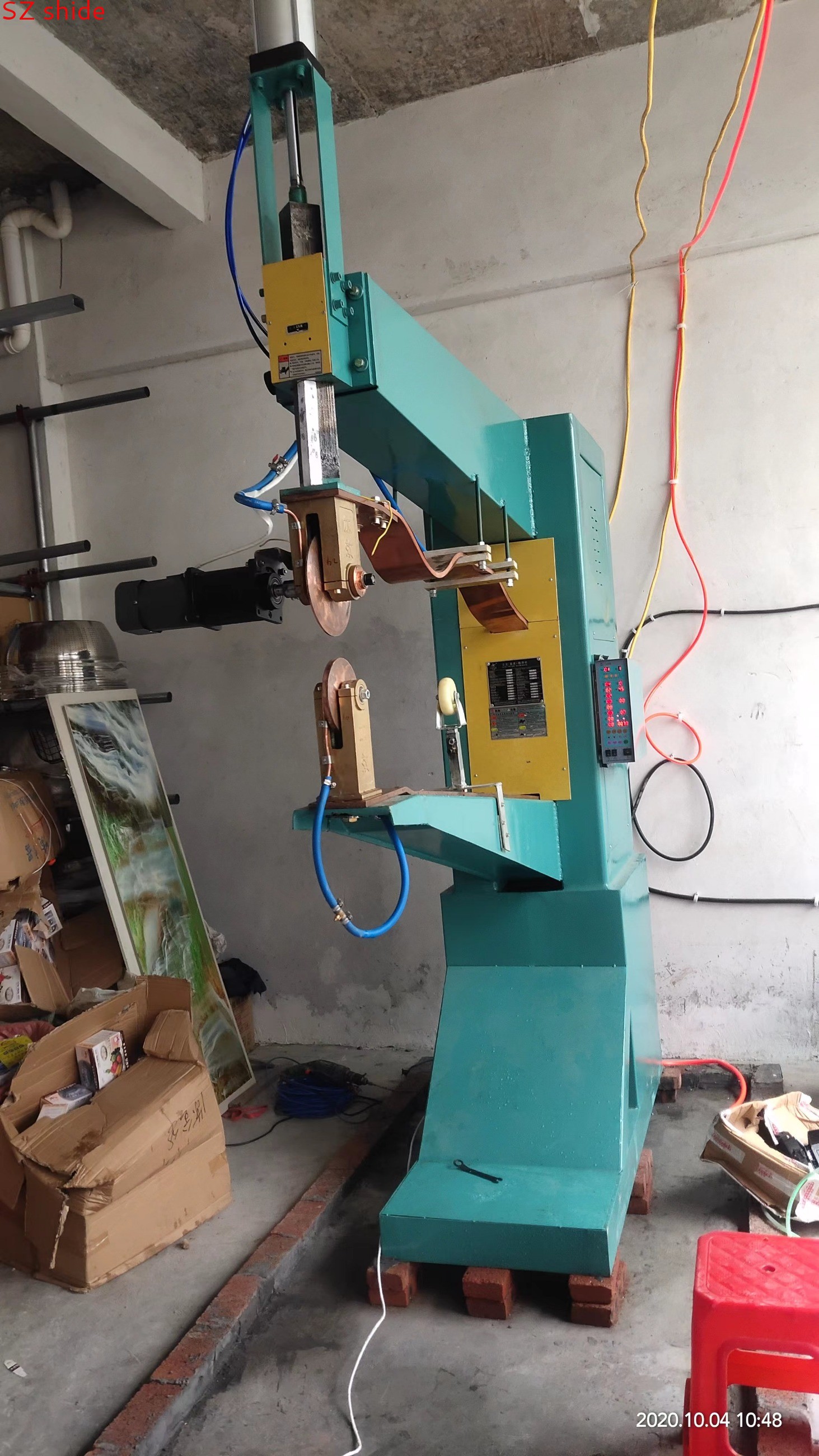 本機(jī)是交流水塔縫焊機(jī),主要用于家用冷水塔的生產(chǎn)制作,可焊接:0.8+0.8mm的不銹鋼,臂長1.6米,